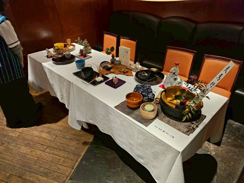 新春、馬、青年部活動で作ったお道具や青年部の特徴を活かしたお道具組で素敵な一服時間となりました。私のお席では親指程の茶筅で小さな楽茶碗で濃茶を練って頂き感動しました。片手の平に最後全て収納出来るコンパクトさに驚きました。