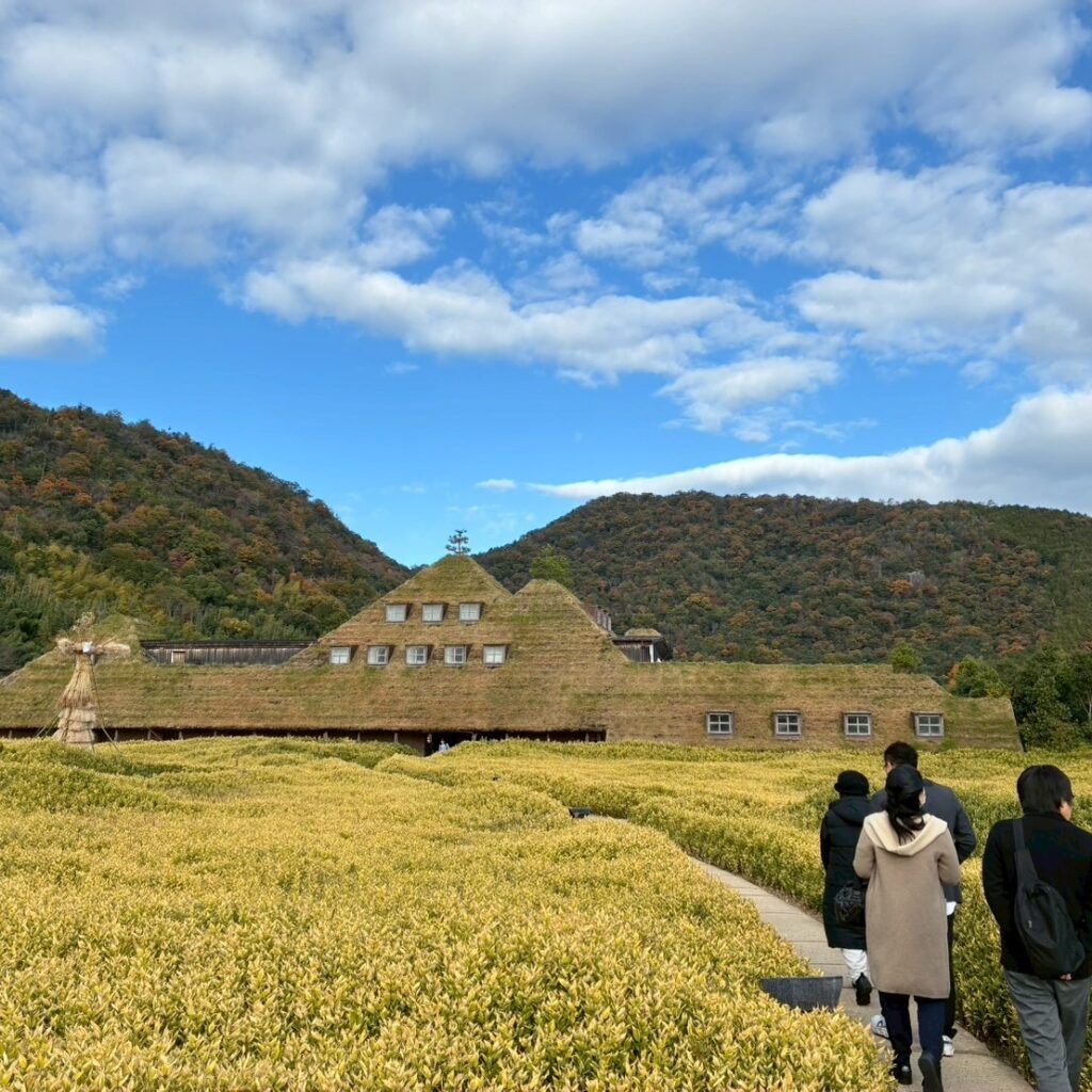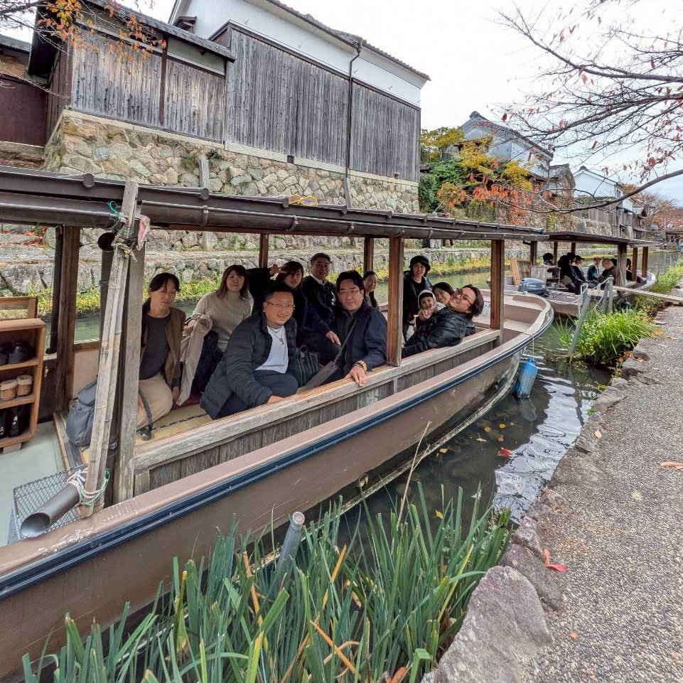 11月22日、紅葉の季節に近江八幡市にて移動交流会を行いました。ご家族、ご友人を含め24人にて近江商人発祥の町近江八幡を満喫しました。まず、たねやクラブハリエのフラッグシップ店「ラコリーナ」に集合しました。駐車場からラコリーナに向かうと赤や黄色に彩られた山を背にした建物の綺麗な景色が私たちを迎えてくれました。今回の交流会は集合の挨拶後、お買い物タイムからスタートです。和菓子のたねやさんと、バームクーヘンで有名なクラブハリエのショップでのお買い物やバームクーヘン工場の見学等をお楽しみいただきました。