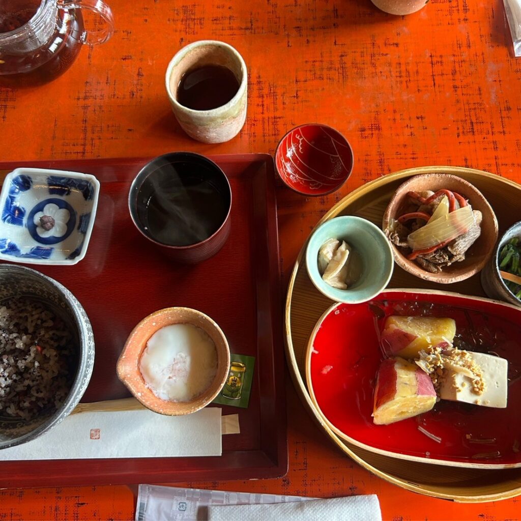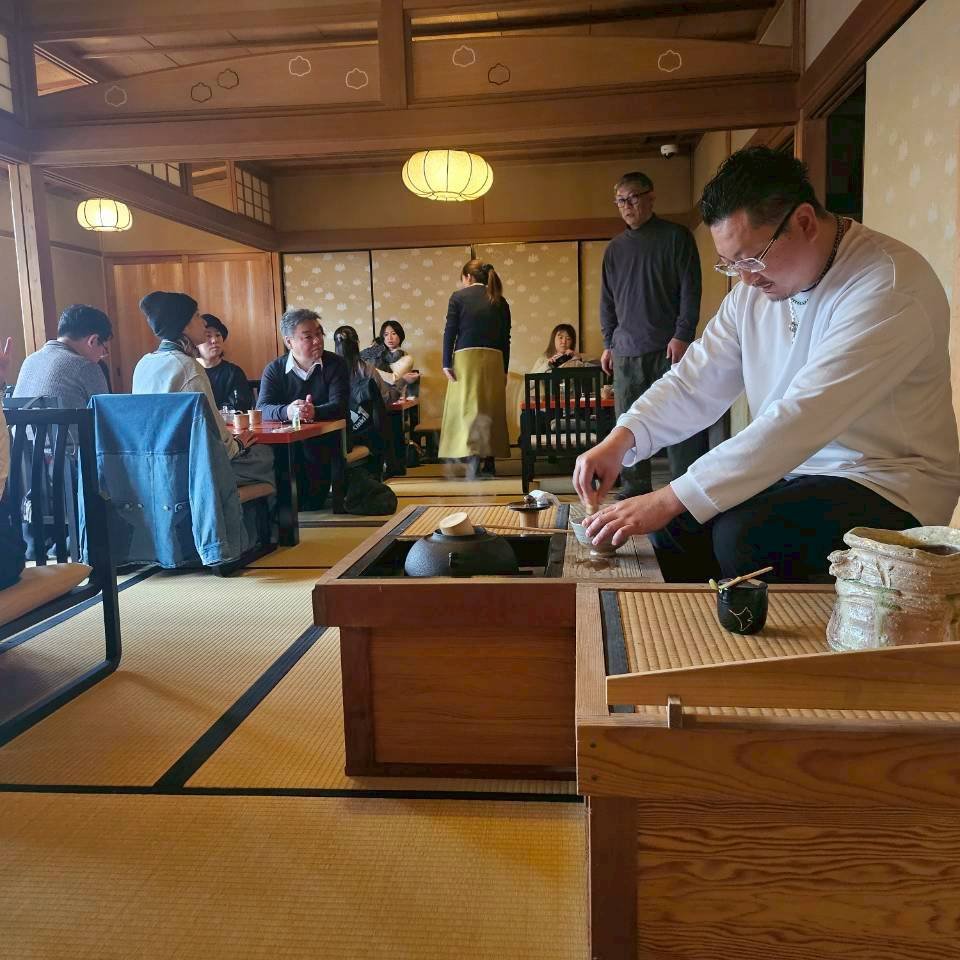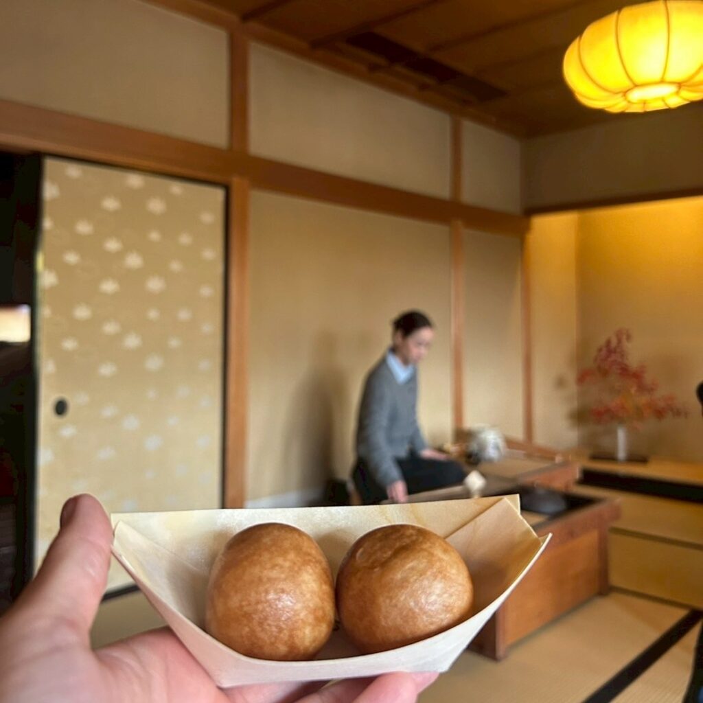 その後車で「たねや 日牟禮乃舍(ひむれのや)」へ移動いただき昼食の時間となりました。配膳がおわるまでの間、一人一人の自己紹介と挨拶が行われ、皆様の事を少し知る事が出来ました。昼食の野菜膳を美味しくいただいた後、出来たての名物つぶら餅が運ばれ呈茶へと移りました。お点前は今年滋賀青年部に入会したばかりの新入会員さんで、皆さんに注目され緊張の様子でした。参加者の方にもお点前をしていただき楽しい時間を過ごした後、ここからは近江八幡の観光です。